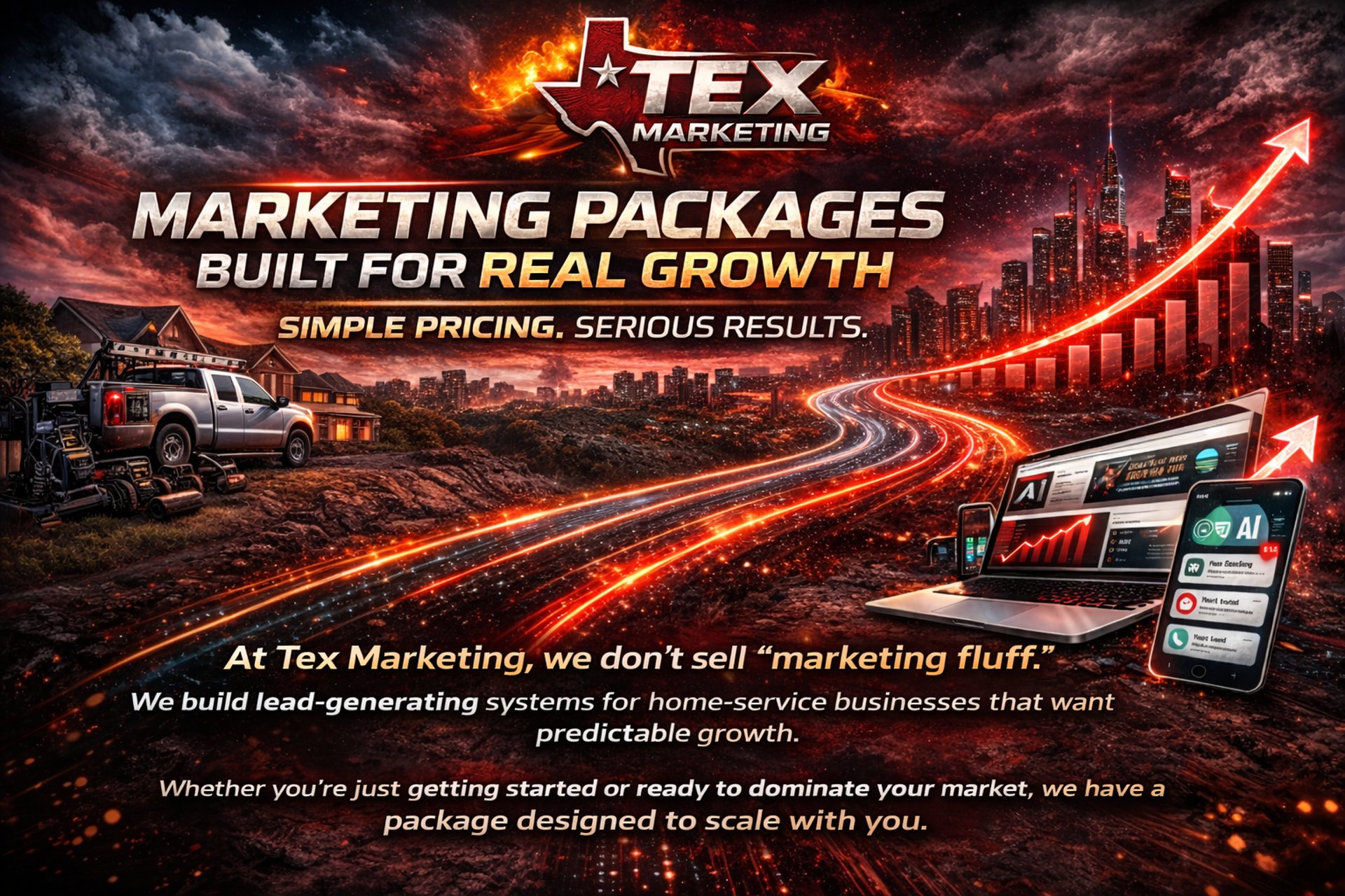 At Tex Marketing, our all-in-one marketing package is built specifically for home-service businesses that want real growth—not just clicks. We combine high-converting website design, local SEO optimization, Google Business Profile management, AI-powered content marketing, paid advertising strategy, and lead-generation systems into one powerful solution. Our marketing package is designed to help contractors, roofers, HVAC companies, plumbers, asphalt companies, and other service professionals dominate local search results, generate consistent leads, and turn website visitors into booked jobs. If you’re looking for a results-driven digital marketing agency that understands the home-service industry and delivers measurable ROI, Tex Marketing is your competitive advantage.